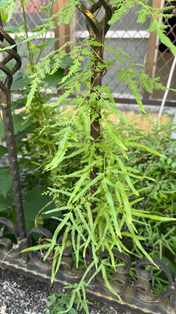 - 葉軸纏繞延伸:不像一般蕨類只長在地面,海金沙的羽狀複葉會延展生長並向上攀爬,可長達數公尺。