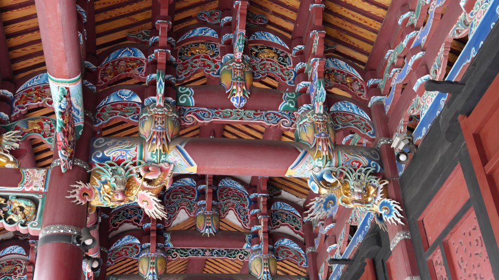 走進大成殿下方,抬頭一看,便能看到屋簷下密密麻麻的彩繪斗拱與懸挑木構。每根樑柱與橫樑交界處,都能看到細緻的彩繪與木雕結合:雲紋、龍紋、牡丹、壽桃等,色彩以紅、綠、藍為主,輔以金線與白點描邊,展現出濃厚的宮殿式工藝風格。