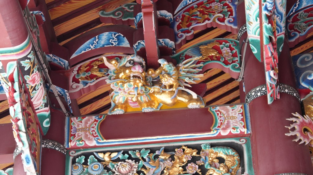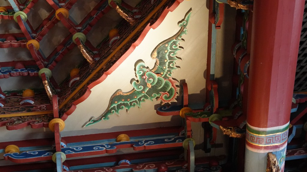 此外,樑柱間常見獅、鳳、鹿、鶴等瑞獸,寓意富貴、高潔、長壽與吉祥。這些裝飾不僅造型精緻,也常運用空間層次與色彩對比製造立體效果,使得整體視覺既莊嚴又富層次感。