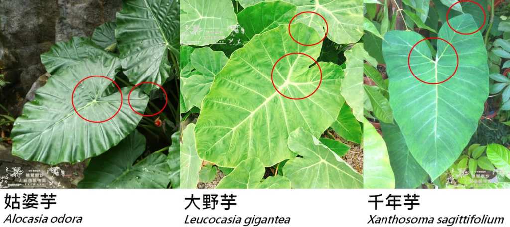 | 千年芋 | 葉端較尖(口訣:千年箭)。 | 葉面有絨毛,水滴在上面容易凝結成水珠狀。 | 脈是閉鎖脈,看起來像鑲邊,葉脈略呈白色。 | 葉面整體較平順。 | 無毒,其子芋可煮來吃。 |