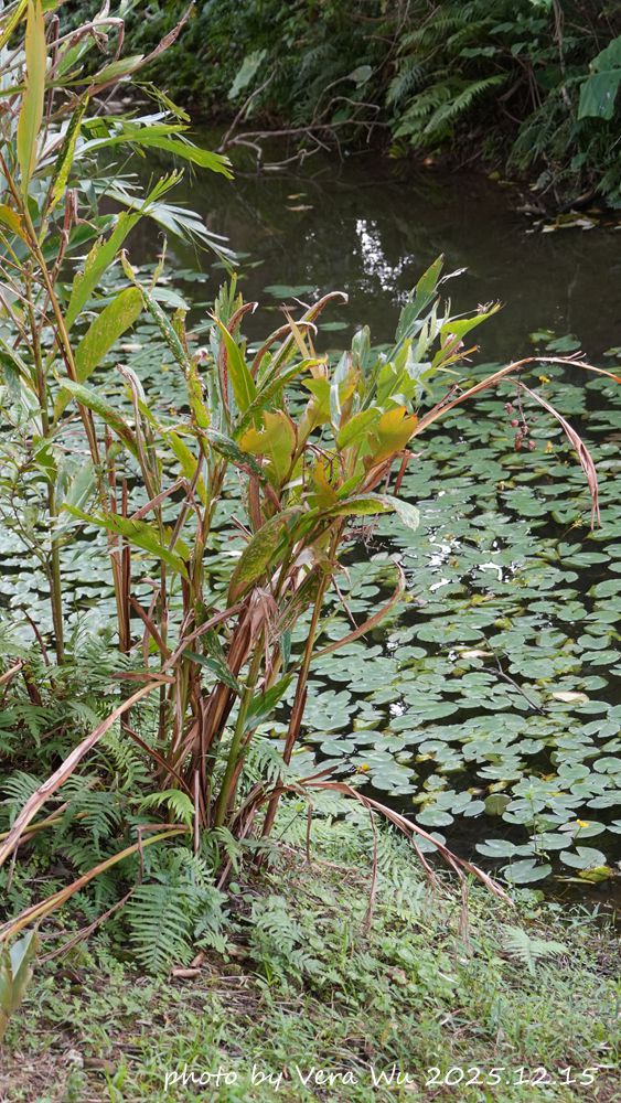 ⬆這株岸邊的植物,經過我仔細的核對。我認為它應該是月桃,因為它的果實在植物右邊可以看得很清楚,只是它是哪一種月桃還更再確認。