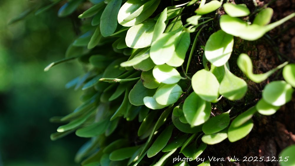 | 伏石蕨,蕨如其名,利用細長的走莖貼伏著石頭生長,一片片橢圓形的小葉子外形像人們日常生活中常吃的瓜子零嘴,所以又稱瓜子蕨。仔細觀察,可以發現這些像綠色小瓜子的伏石蕨中夾雜著幾片比較細長的葉片,翻開細長葉長的背面,可以看到許多像金沙般密集分佈的孢子囊,這是伏石蕨的「繁殖葉」。 伏石蕨常是葉子順著細長的根狀莖稀疏的長著。不過它也很容易長成密密麻麻的一大片,看起來就像是被固定住,尤其大石頭上常常可以看到,所以也被稱為石瓜子、風不動。但它也喜歡沿著大樹生長,所以也稱為抱樹蕨、抱樹蓮。至於鏡面草、螺厴草、豆片草、瓜子草、瓜子金這些別名都是來自於伏石蕨的葉片型態。但它長有孢子囊群的繁殖葉會長高變細,這樣會讓孢子在成熟後能夠飄到更遠的地方。這種葉子因為功能不同,分成只行光合作用不長孢子囊的營養葉與會長孢子囊的繁殖葉(孢子葉),並有兩種型態的現象,在蕨類植物中偶而可以看到。 一般來說,依附在大樹或是岩石上的著生型蕨類植物喜歡水氣豐沛的環境,常常營造出鬱鬱蔥蔥的原始森林景象。但有些種類長期適應濕度高的環境後,變成在濕度較低的環境不易生存,限制了族群分布區域,有些甚至成為稀有植物。伏石蕨的肥厚肉質葉片可以保存較多水分,抵擋短期的缺水。如果缺水嚴重,葉片就會掉落,等到水分充足時才重新生長,這興特性讓它比不少其他著生型蕨類植物更具生存優勢。 伏石蕨的拉丁文學名中,屬名Lemmaphyllum是由希臘文的lemma(皮)與phyllon(葉)合併締造而來,意指它的葉片乾了之後質地如皮革。種小名microphyllum是「小葉的」的意思。 以上文字部份引自國立自然科學博物館網站資料 |
