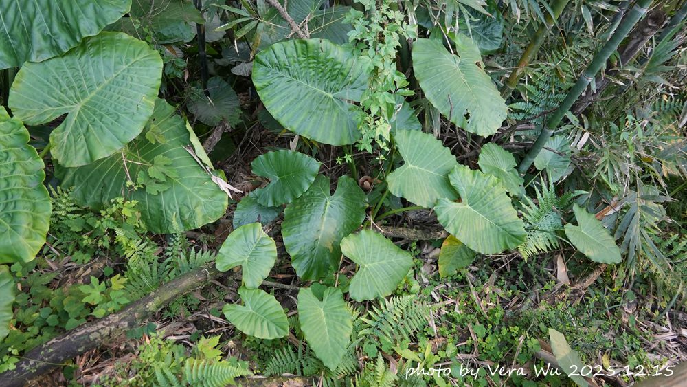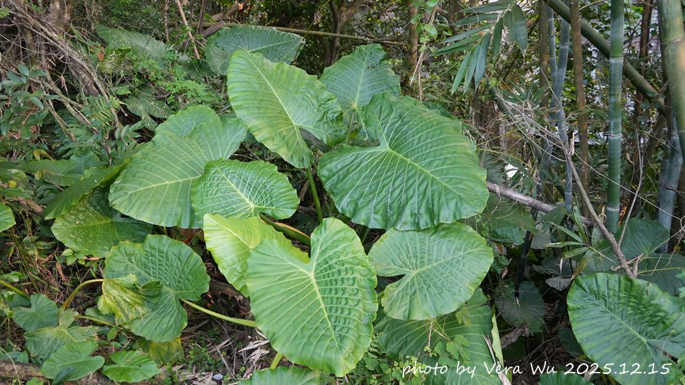 ⬆菇婆芋。全株有毒,勿食用。以前海產店常用菇婆芋的葉子當作海鮮襯底。它的大葉面也可以拿來當傘遮雨。