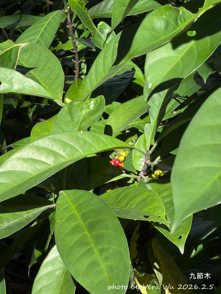 九節木是茜草科植物,平常它並不吸引人的目光,但一等到秋冬時分,各種顏色的果實(紅、黃、橘和綠)十分吸睛,讓人很難不注意到它的存在。