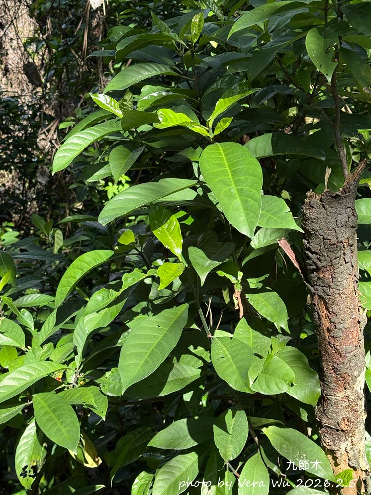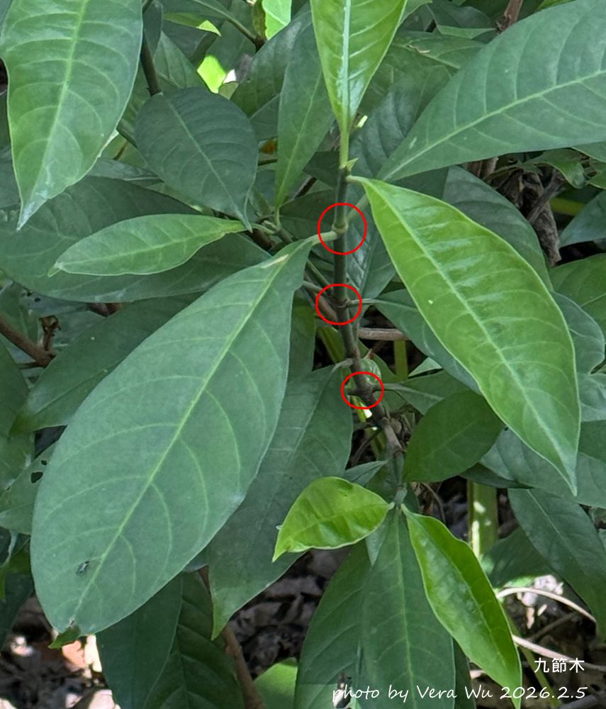 節是植物莖上會長出葉子的地方,通常植物的枝條都不會無規律的生長,而會在節的部位長出來。由於九節木是茜草科植物,在這裡也提供幾個辨識茜草科植物的好方法。